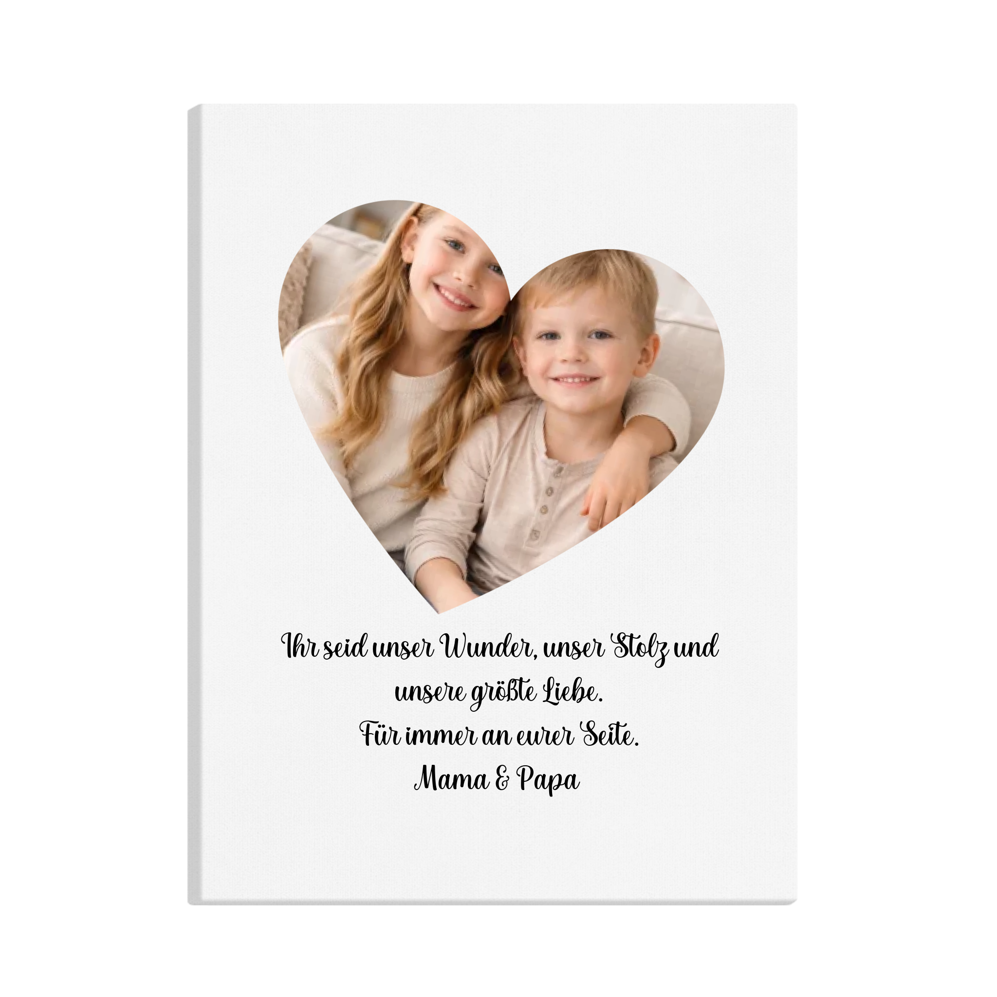 Das Canvas hat das Format 30 × 40 cm und zeigt ein Foto in Herzform mit persönlichem Wunschtext. Es wird als hochwertiger Leinwanddruck auf einen stabilen Holzrahmen gespannt geliefert, ist fertig montiert und kann direkt aufgehängt werden. Geeignet für den Innenbereich.