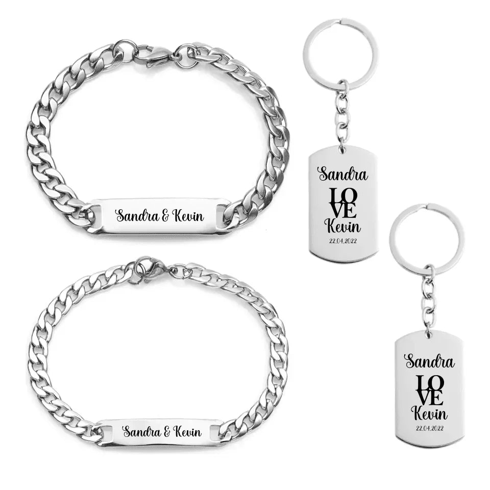 Entdecken Sie unser exklusives Set mit zwei eleganten Edelstahlschlüsselanhängern und zwei stilvollen Edelstahlarmbändern! 💖✨ Diese personalisierten Schmuckstücke sind perfekt für verliebte Pärchen. Jedes Armband kann mit euren Initialen oder einem besonderen Datum graviert werden und wird so zu einem einzigartigen Symbol eurer Liebe. Die robusten Schlüsselanhänger sind ideale Begleiter im Alltag und lassen euch ein Stück eurer Zweisamkeit überallhin mitnehmen. Ob als Geschenk oder für euch selbst – diese Edelstahl-Schmuckstücke stehen für ewige Verbundenheit! 💞🔗