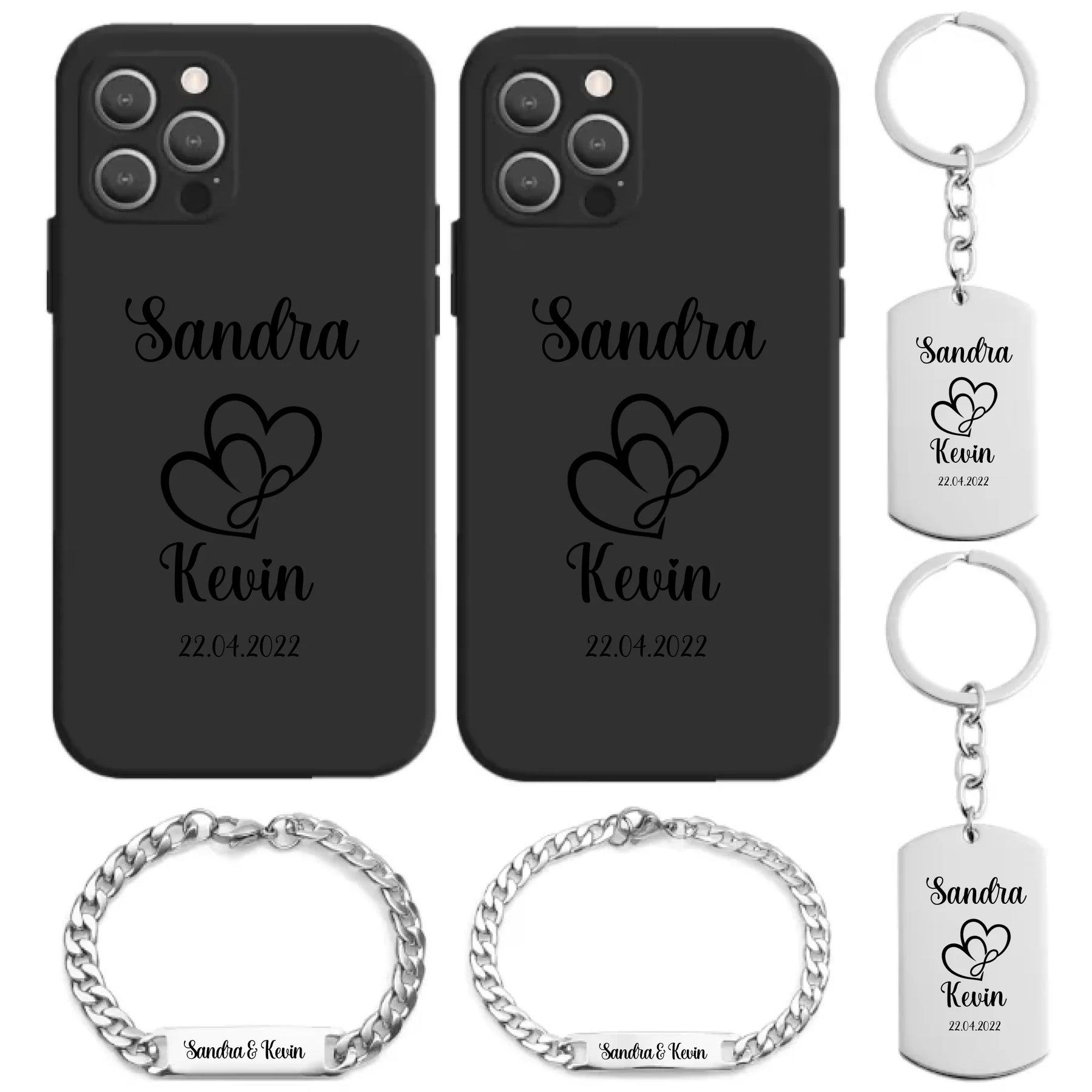 -2x Handyhüllen / 2xEdelstahl Pärchen Armbänder für Damen und Herren / 2x Edelstahl Schlüsselanhänger / 1x Geschenkbox aus Holz