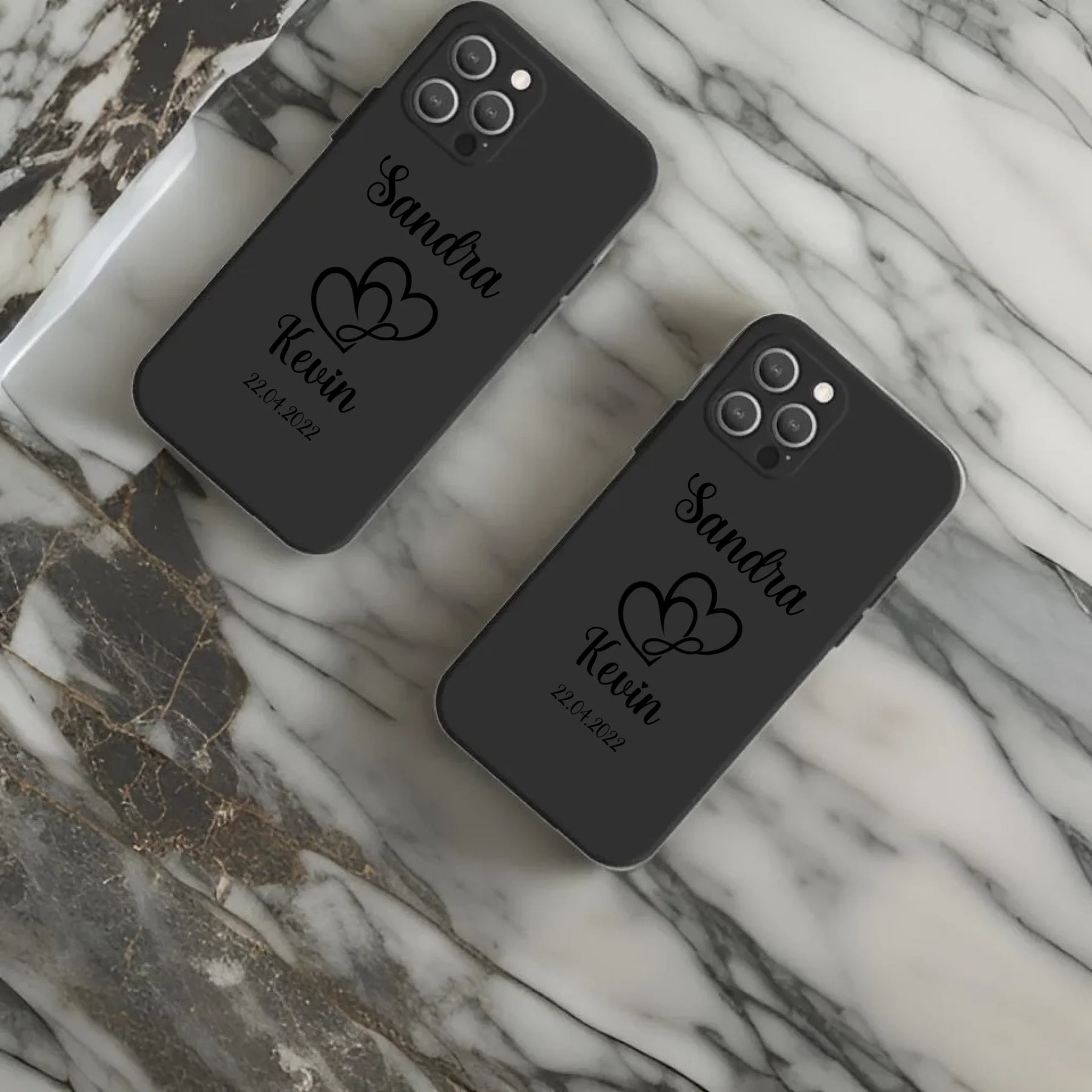 Schützen Sie Ihre Smartphones stilvoll! Die hochwertigen Handyhüllen sind für verschiedene Modelle erhältlich und können mit den Namen oder Initialen des Paares versehen werden. So strahlen Sie nicht nur zusammen, sondern haben auch immer eine persönliche Note dabei.